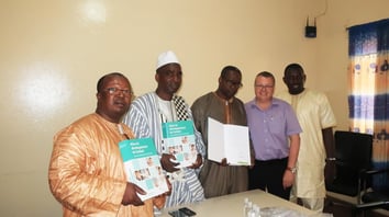 Photo (de gauche à droite): Dr. Ibrahima Sory Diallo, Directeur général de l'INSE, la seule néonatologie universitaire de la Guinée; Dr. Saliou Bella Diallo, Médecin chef de la Pédiatrie de l'Hôpital Universitaire de Donka à Conakry; Dr. Hassimiou Dia, Médecin chef de la Pédiatrie de l'Hôpital Universitaire de Ignace Deen à Conakry; Prof. M. Roth-Kleiner de souffle2vie; Dr. Moustapha Diop, Médecin chef de l'Unité d'hémato-oncologie de l'Hôpital Universitaire de Donka à Conakry.