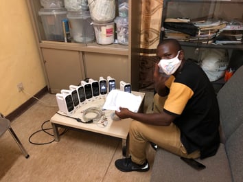 en bas: Installation par l'ingénieur bio-médical, M. Holland Barry, d'une nouvelle version de logiciel à tous les 8 saturomètres installés maintenant à l'INSE.