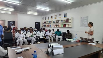 Photo: Céline Lomme donne un cours à l'ensemble des soignant-e-s de l'Hôpital ANAIM de Kamsar.